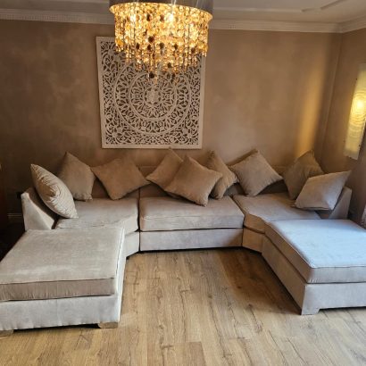 Elegant and spacious U-shaped velvet sofa designed for maximum comfort and modern living spaces. Perfect for large families and stylish lounge areas.
