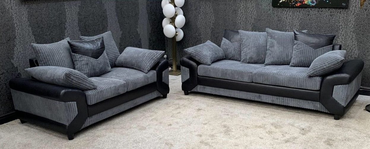The set includes a spacious 3-seater sofa and a matching 2-seater sofa, both featuring deep padded cushions and multiple scatter back pillows for relaxed and flexible comfort. The mix of ribbed fabric and smooth faux leather gives this sofa a unique, high-end finish.
